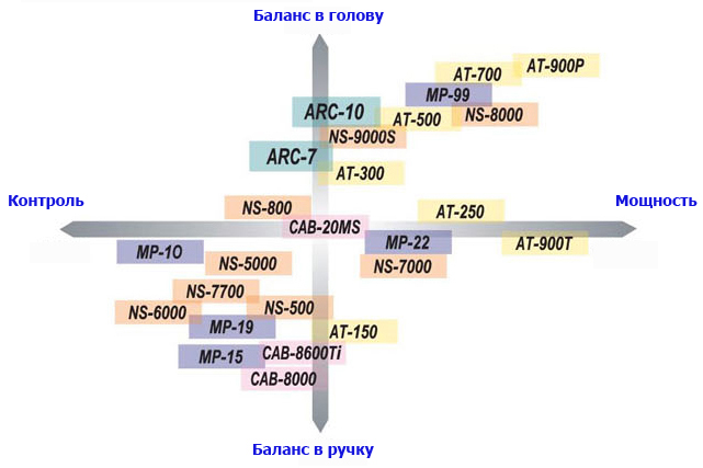 - балланс ракетки. Балланс смещен в ручку - для защитной игры - серия NANOSPEED. Балланс в голову - для нападения (смеш) - серия ARMOTEC. Нейстральный (средний) балланс - универсальные ракетки - cерия ARCSABER, Basic, MusclePower.